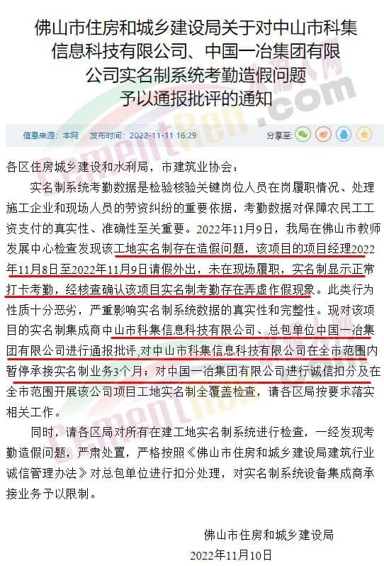 因此,對中山市科集信息科技有限公司、總包單位中國一冶集團有限公司進行通報批評。對中山市科集信息科技有限公司在全市范圍內(nèi)暫停承接實名制業(yè)務(wù)3個月;對中國一冶集團有限公司進行誠信扣分及在全市范圍開展該公司項目工地實名制全覆蓋檢查。