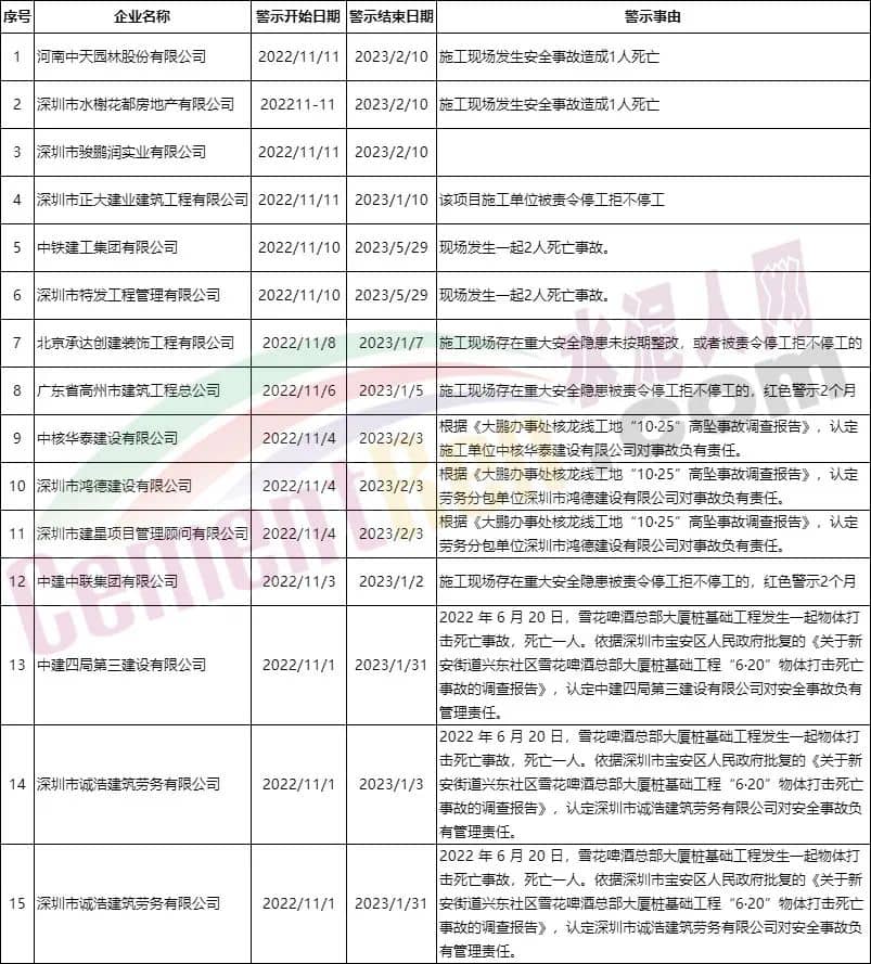 據(jù)查詢,11月1日至今,深圳市住建部門通報實施紅色警示的企業(yè)共有包括中鐵建、中建中聯(lián)、中建四局等建筑企業(yè)在內(nèi)的15家企業(yè),警示結(jié)束日期為2023年1月~5月。