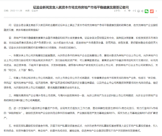 11月28日,證監(jiān)會新聞發(fā)言人表示,證監(jiān)會決定在股權融資方面調整優(yōu)化5項措施,并自即日起施行。包括恢復涉房上市公司并購重組及配套融資、恢復上市房企和涉房上市公司再融資等,這被稱為近期利好房地產行業(yè)的“第三支箭”。