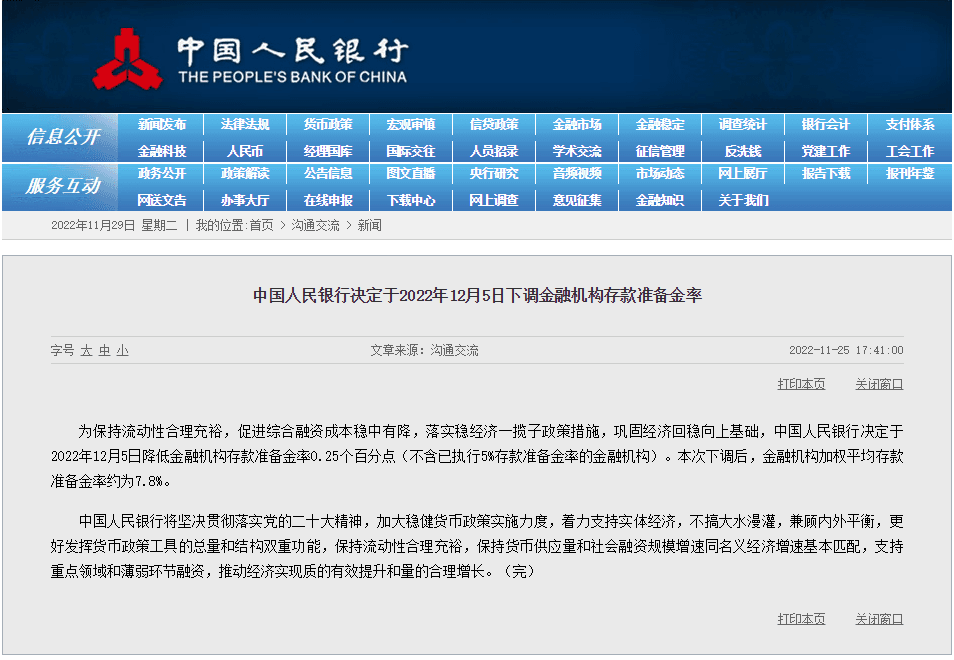 在國務院常務會議“預告”降準后,中國人民銀行隨即表示將于2022年12月5日降低金融機構存款準備金率0.25個百分點(不含已執(zhí)行5%存款準備金率的金融機構)。本次下調后,金融機構加權平均存款準備金率約為7.8%。中國人民銀行有關負責人介紹稱,此次降準共計釋放長期資金約5000億元,降低金融機構資金成本每年約56億元。