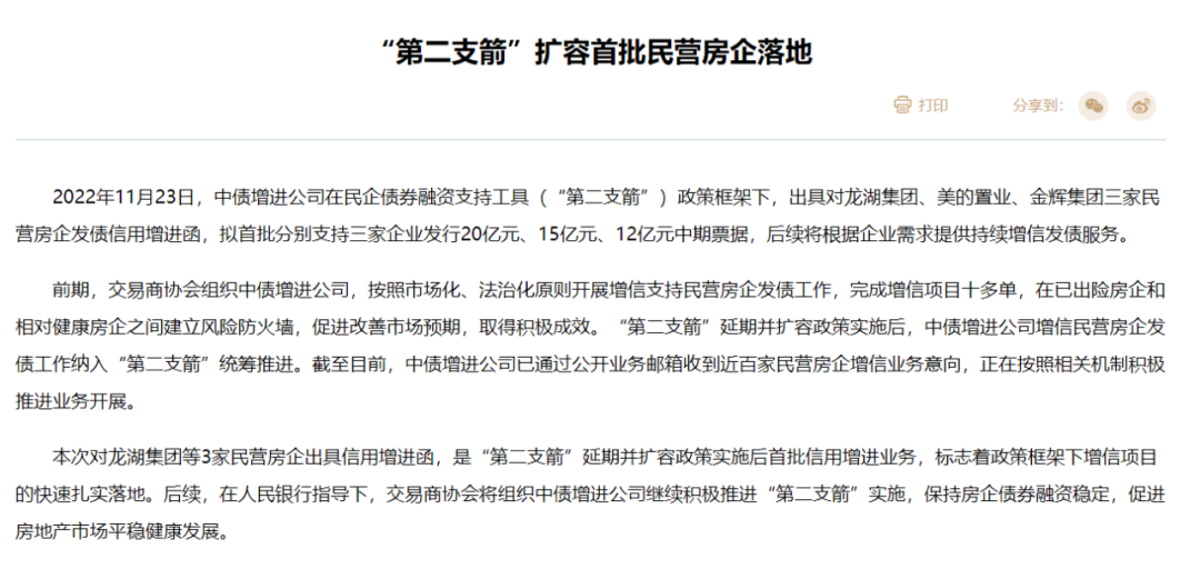 同日,中國銀行間市場交易商協(xié)會發(fā)文稱,已對龍湖集團、美的置業(yè)、金輝集團三家民營房企發(fā)債信用增進函,合計支持三家企業(yè)發(fā)行近50億元的中期票據,后續(xù)將根據企業(yè)需求提供持續(xù)增信發(fā)債服務。