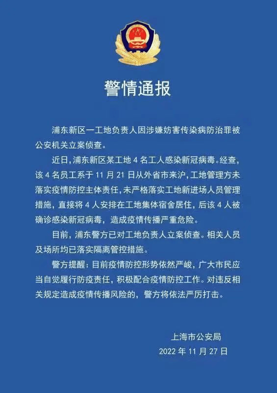 據(jù)上海市公安局通報,近日,浦東新區(qū)某工地4名工人感染新冠病毒。相關工地負責人因涉嫌妨害傳染病防治罪被公安機關立案偵查。