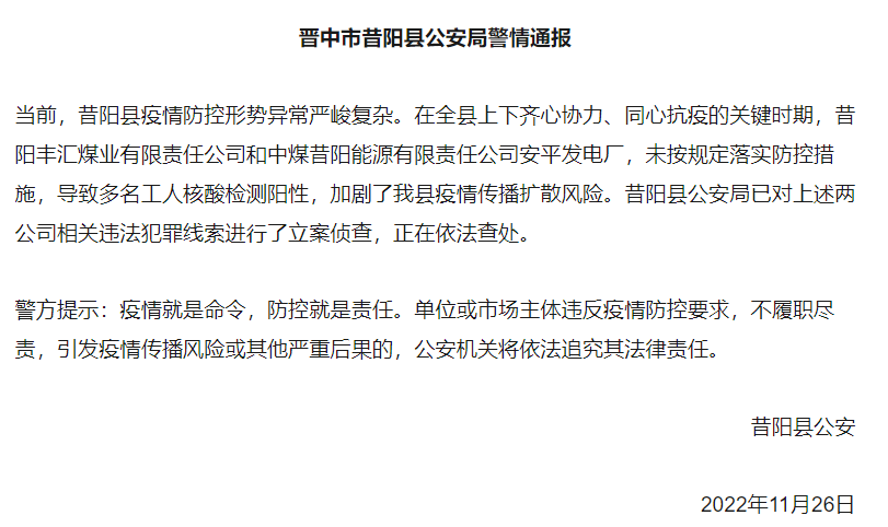 11月26昔陽縣公安局通報,昔陽豐匯煤業(yè)有限責任公司和中煤昔陽能源有限責任公司安平發(fā)電廠,未按規(guī)定落實防控措施,導致多名工人核酸檢測陽性,加劇了當?shù)匾咔閭鞑U散風險。昔陽縣公安局已對上述兩公司相關違法犯罪線索進行了立案偵查。