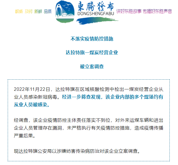 2022年11月22日,內蒙古達拉特旗在區(qū)域核酸檢測中檢出一煤炭經(jīng)營企業(yè)從業(yè)人員感染新冠病毒。經(jīng)進一步篩查發(fā)現(xiàn),該企業(yè)內部的多個煤場均有從業(yè)人員被感染。
