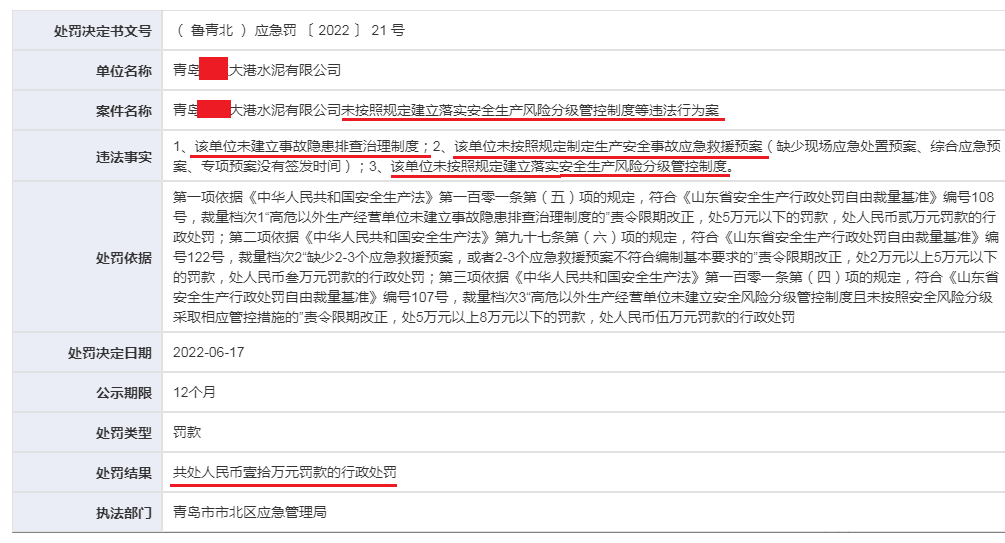 據青島市市北區(qū)應急管理局的處罰決斷書,對青島某水泥有限公司未按照規(guī)定建立生產風險分級管控制度等行業(yè)案作出罰款10萬元的行政處罰。