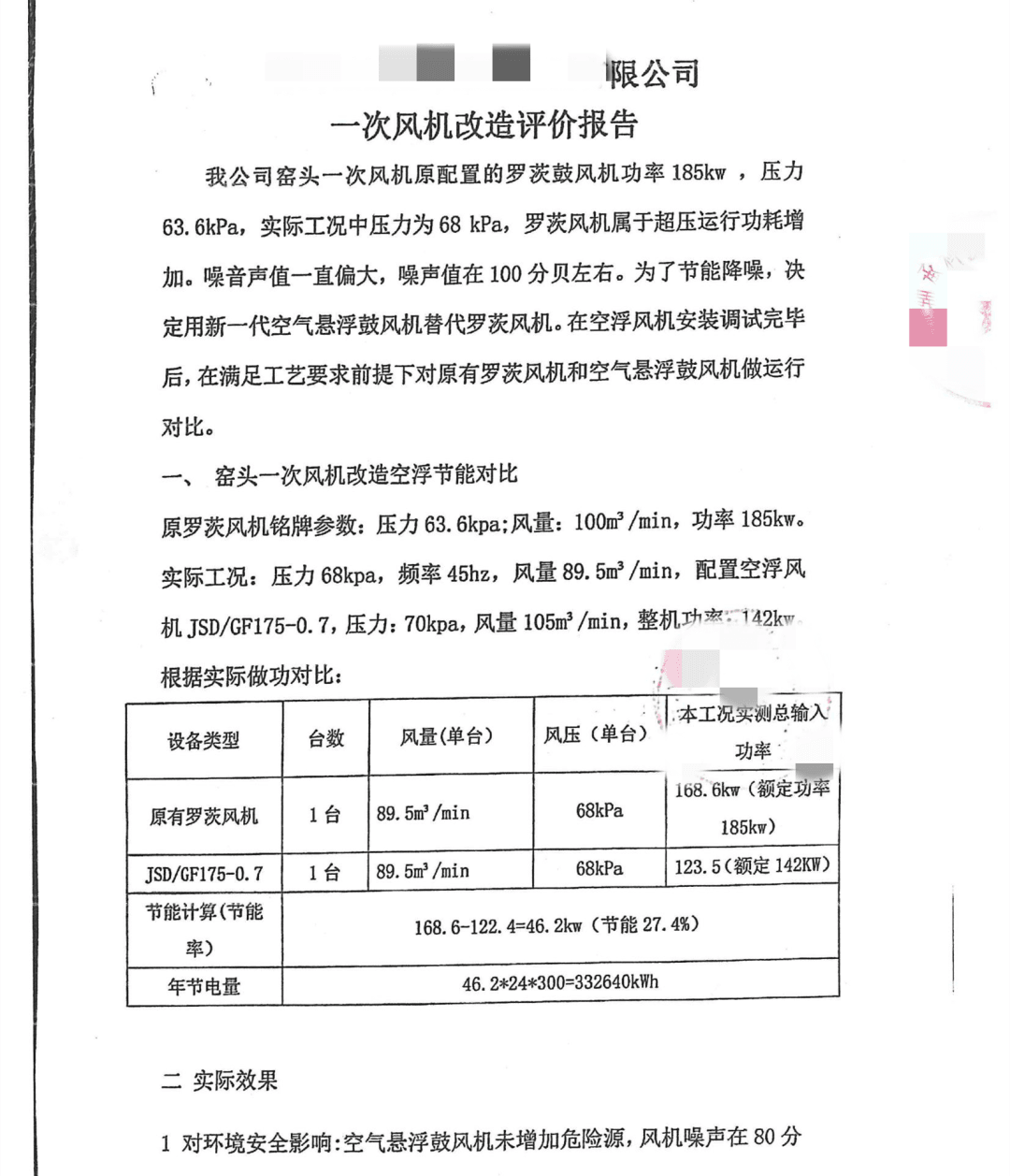 本次窯頭一次風(fēng)機(jī)改造空氣懸浮鼓風(fēng)機(jī)全年可節(jié)省332640kwh電量,節(jié)能效率達(dá)到27.4%,滿足合同(不低于25%)要求,整體噪音下降至80分貝,在滿足工藝要求下達(dá)到了節(jié)能和噪音控制需求。改造報告如下: