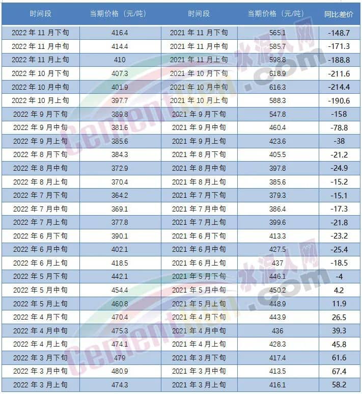 2022年以來,水泥價(jià)格波動(dòng)頻繁,流通領(lǐng)域P.O42.5散裝水泥報(bào)價(jià)自5月下旬以來,同比2021年卻一直處于低位。10月中下旬同比差價(jià)達(dá)到200元/噸以上,11月下旬同比上年同期差價(jià)148.7元/噸。