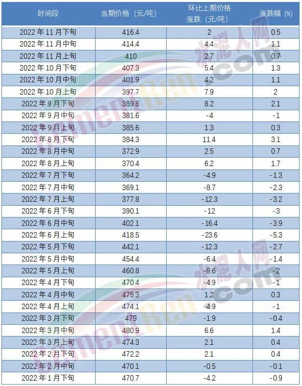 從2022年1月至今數(shù)據(jù)來看,6月上旬水泥價(jià)格直跌23.6元/噸,跌幅5.3%,為年內(nèi)最大跌幅。8月下旬環(huán)比上漲11.4元/噸,漲幅3.1%,跌多漲少。且3月下旬至7月下旬一直處于環(huán)比下跌狀態(tài)。盡管從8月上旬至今水泥價(jià)格一直趨于上漲通道,但是11月下旬的報(bào)價(jià)仍較今年1月下旬要低54.3元/噸,最高報(bào)價(jià)3月中旬480.9元/噸,最低價(jià)為7月下旬364.2元/噸,差價(jià)116.7元/噸。
