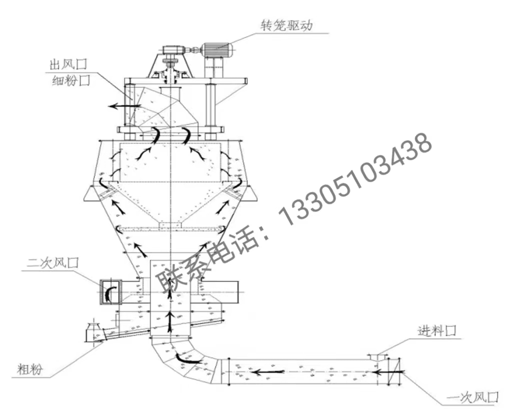 該選粉機突破了原有超細分級機生產能力小、選粉效率低,比表面積難于提高、微細粉宜團聚難于分散等多項技術瓶頸,解決了超細分級設備無法實現大規(guī)模分選超細微粉的關鍵技術難題。該選粉機分級精度準,選粉效率高,選粉效率平均值達到80.6%。在高選粉效率的情況下,保證適中的循環(huán)負荷(120%),以保證物料在超細球磨機內能夠得到充分的研磨,可根據用戶需要生產比表在700~1000m2/kg的超細微粉。