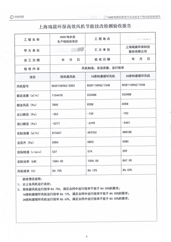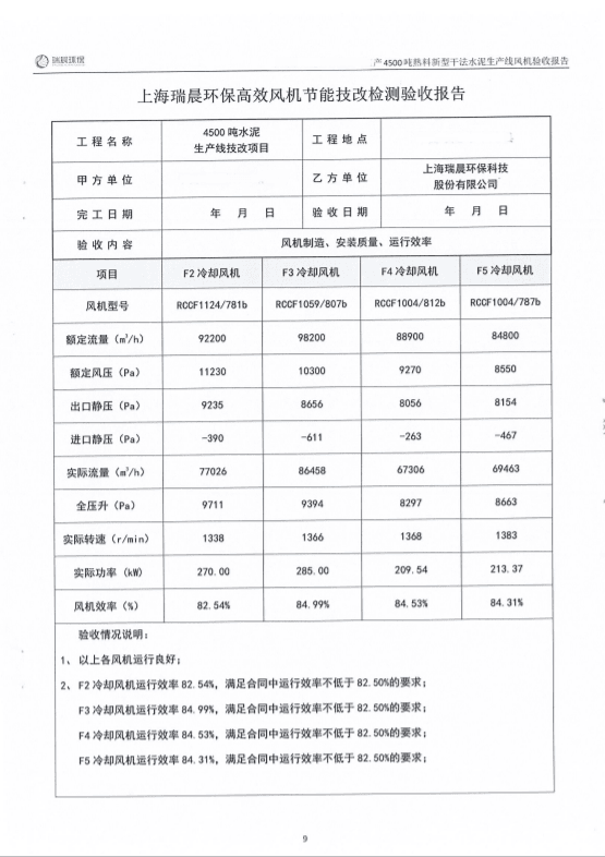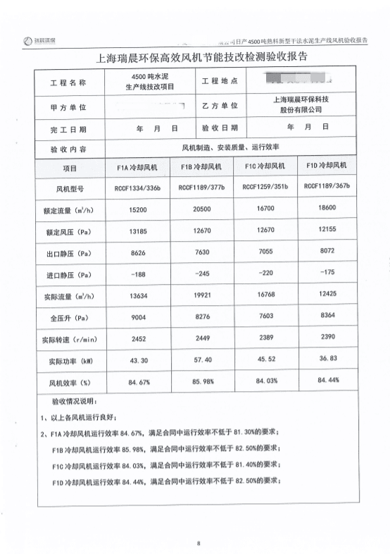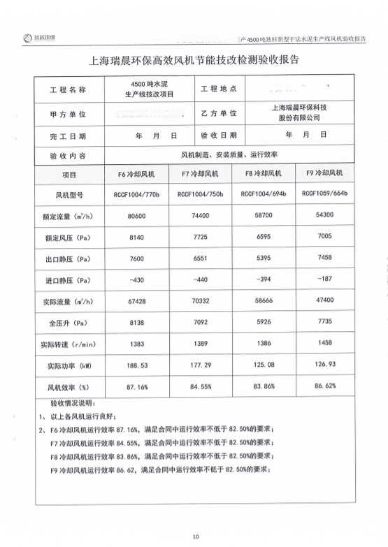 2022年8月,該水泥企業(yè)組織雙方共同對全線風機進行了聯(lián)合驗收測試。測試結(jié)果顯示,風機運行良好,實測效率優(yōu)于合同約定效率,達到雙方約定的驗收指標,風機單耗低,使用效果好。