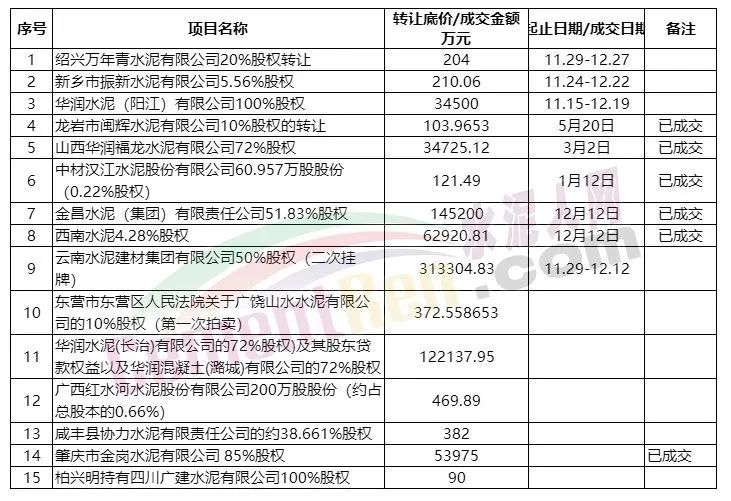 華潤水泥、萬年青水泥、中材水泥等水泥集團企業(yè)部分股權(quán)公開交易