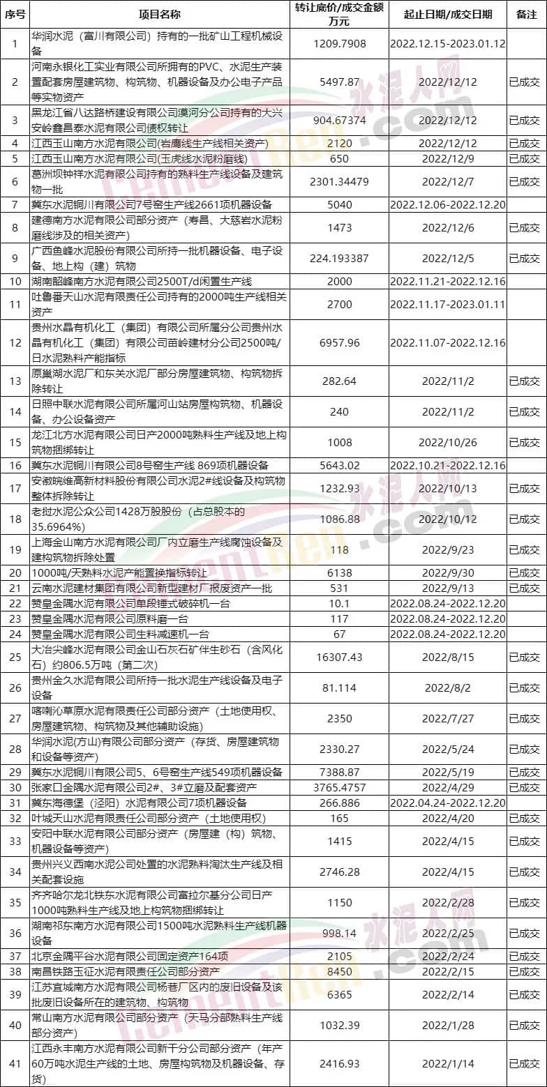 除上述水泥企業(yè)股權(quán)公開交易外,更多企業(yè)為清退無效、低效資產(chǎn)在產(chǎn)權(quán)交易平臺公開出售旗下設(shè)備、土地、礦山以及產(chǎn)能指標(biāo)等。涉及企業(yè)不僅包括中國建材集團旗下水泥企業(yè)也包含金隅冀東、華潤、葛洲壩、尖峰、魚峰等行業(yè)龍頭企業(yè),涉及金額超10.69億。