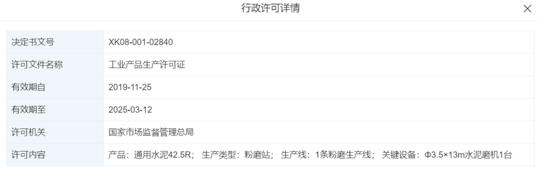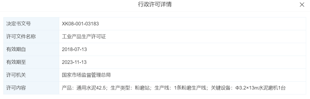 據(jù)查詢,廣西梧州市萬(wàn)凌水泥有限公司生產(chǎn)許可證編號(hào)XK08-001-02840,有效期至2025年3月12日。企業(yè)類型為粉磨站,擁有一條粉磨生產(chǎn)線,關(guān)鍵設(shè)備為Φ3.5×13m水泥磨機(jī)1臺(tái)。
