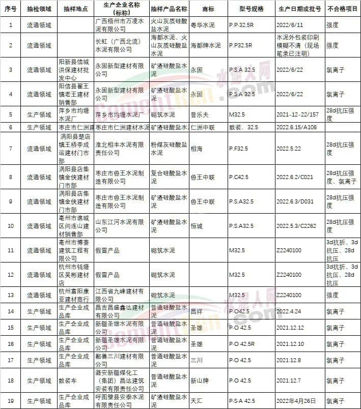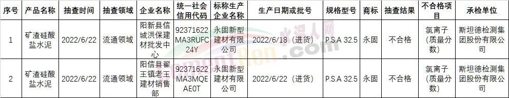 山東省濱州流通領(lǐng)域抽檢同一家企業(yè)兩批次水泥氯離子不合格