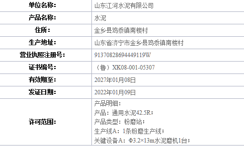 山東江河水泥有限公司生產(chǎn)許可證編號(hào)(魯)XK08-001-05307,有效期至2027年1月8日,企業(yè)類型為粉磨站;企業(yè)擁有1條粉磨生產(chǎn)線;關(guān)鍵設(shè)備為Φ3.2×13m水泥磨機(jī)1臺(tái);企業(yè)“恒誠(chéng)”商標(biāo)已注冊(cè)。