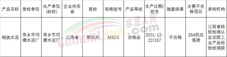 江西省市場(chǎng)監(jiān)督管理局對(duì)全省水泥產(chǎn)品質(zhì)量進(jìn)行了監(jiān)督抽查。經(jīng)檢驗(yàn),不合格產(chǎn)品1批次,涉及的不合格項(xiàng)目為28天抗壓強(qiáng)度。不合格標(biāo)稱生產(chǎn)單位為萍鄉(xiāng)市均塘水泥廠普樂(lè)夫牌M32.5水泥。