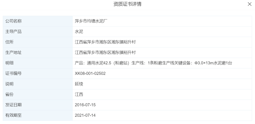 據(jù)查詢,萍鄉(xiāng)市均塘水泥廠生產(chǎn)類型為粉磨站,生產(chǎn)許可證編號(hào)為XK08-001-02502。該編號(hào)生產(chǎn)許可證有效期截止到2021年7月14日,目前已處于無(wú)效狀態(tài)。且“普樂(lè)夫”品牌亦非該企業(yè)自有。