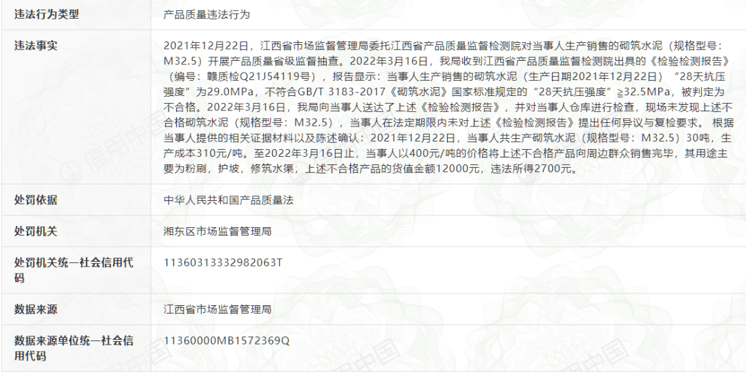 據(jù)查詢, 因生產(chǎn)銷售不合格水泥萍鄉(xiāng)市均塘水泥廠被罰沒(méi)人民幣25500元。