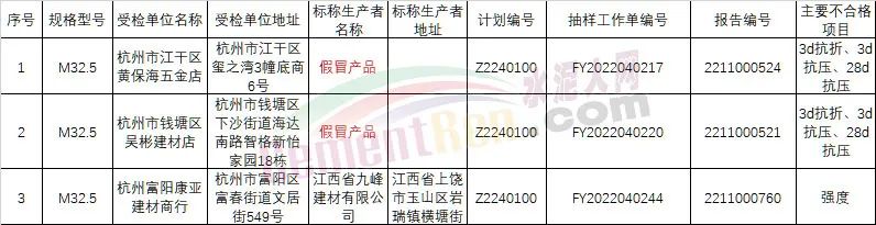 杭州市江干區(qū)黃保海五金店和杭州市錢塘區(qū)吳彬建材店抽檢到兩批次M32.5水泥為假冒產(chǎn)品,主要不合格項(xiàng)目為3d抗折、3d抗壓、28d抗壓;杭州富陽(yáng)康亞建材商行M32.5水泥,標(biāo)稱生產(chǎn)者為江西省九峰建材有限公司主要不合格項(xiàng)目為強(qiáng)度。