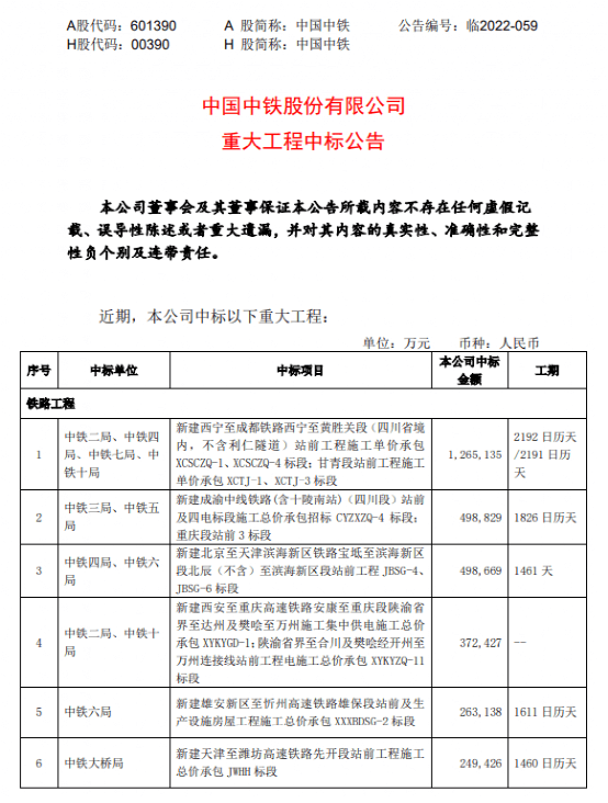 日前,中國中鐵、中國鐵建分別發(fā)布重大工程中標(biāo)公告。
