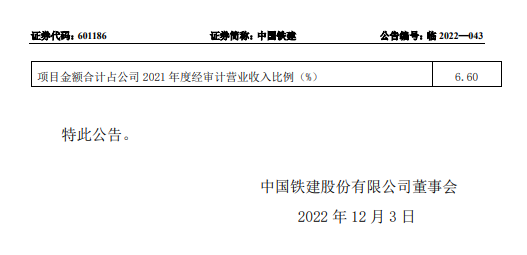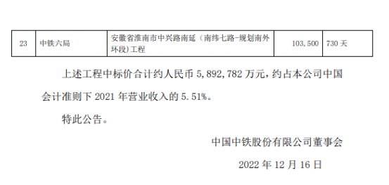 中國中鐵中標(biāo)價合計約人民幣589億元,約占公司2021年營業(yè)收入的5.51%。