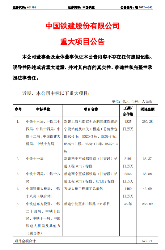中國鐵建發(fā)布重大項目公告稱,已中標(biāo)合計672億重大項目。