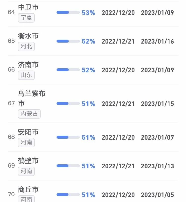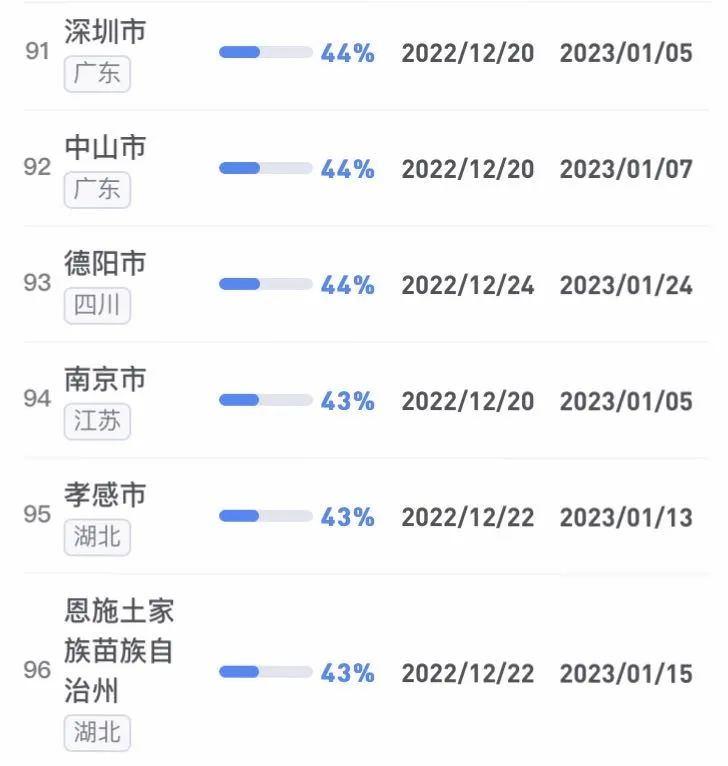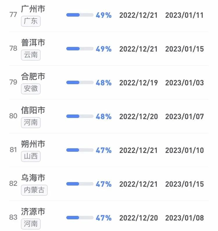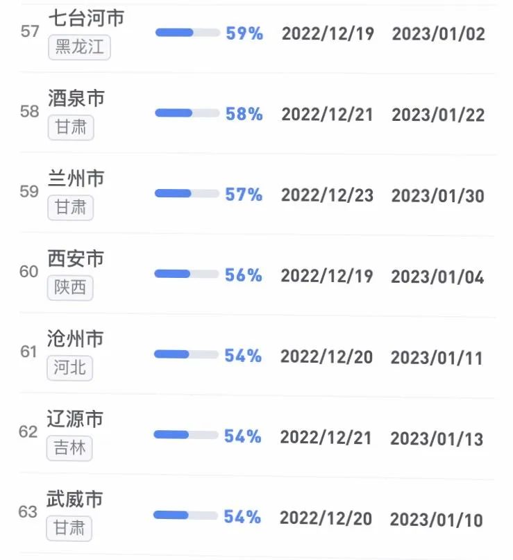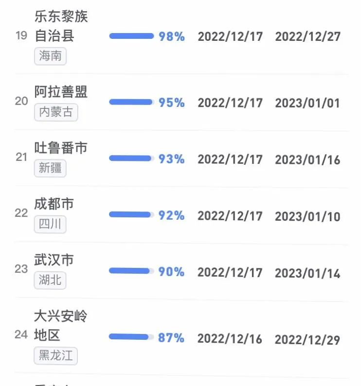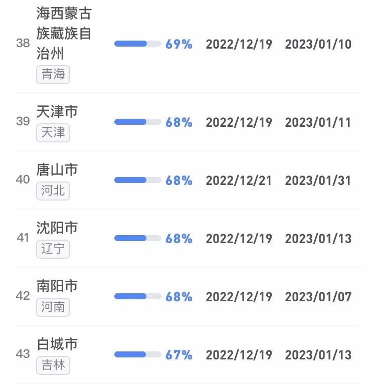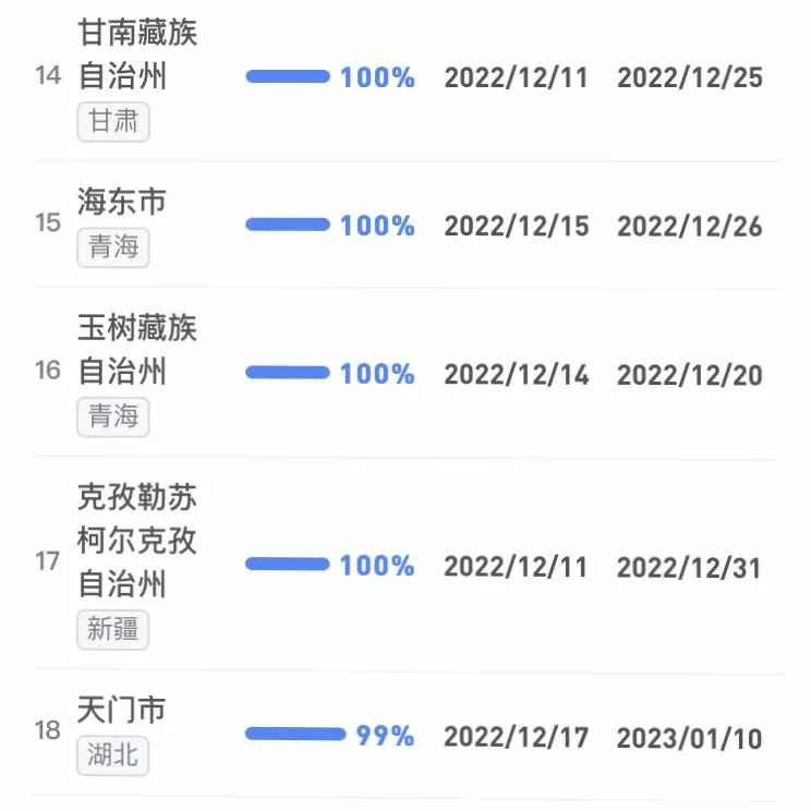 據(jù)不完全統(tǒng)計,全國感染進度100%的城市已累計達17個,其中石家莊市、保定市、甘南藏族自治州、克孜勒蘇柯爾克孜自治州均在12日就達到首輪感染峰值。成都市、武漢市等76個市達峰進度已超過50%。