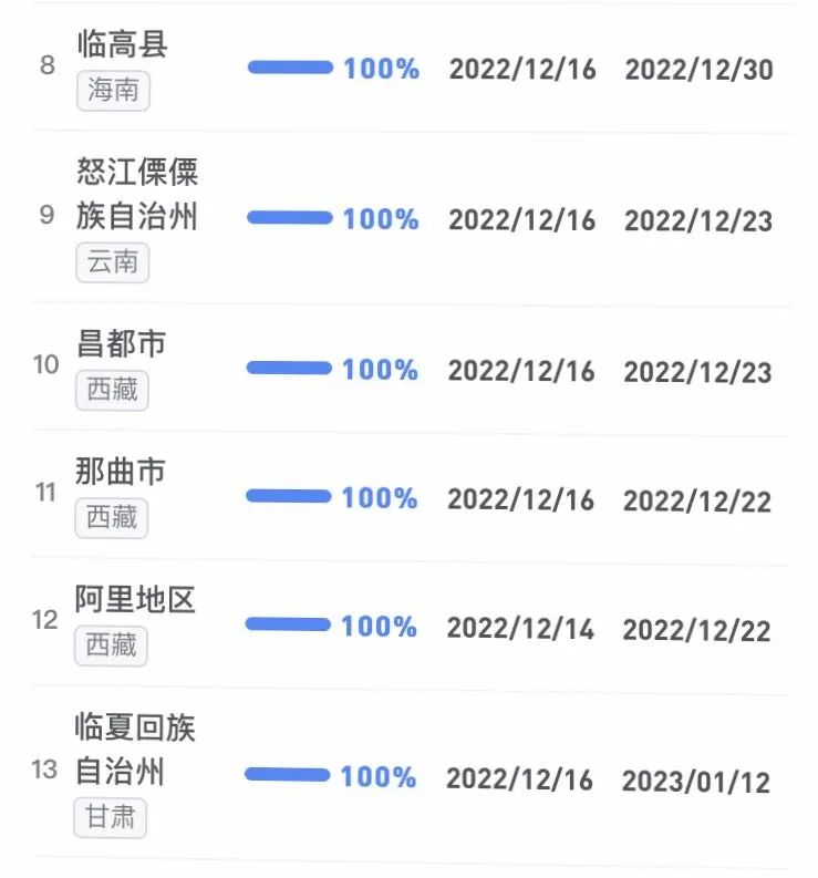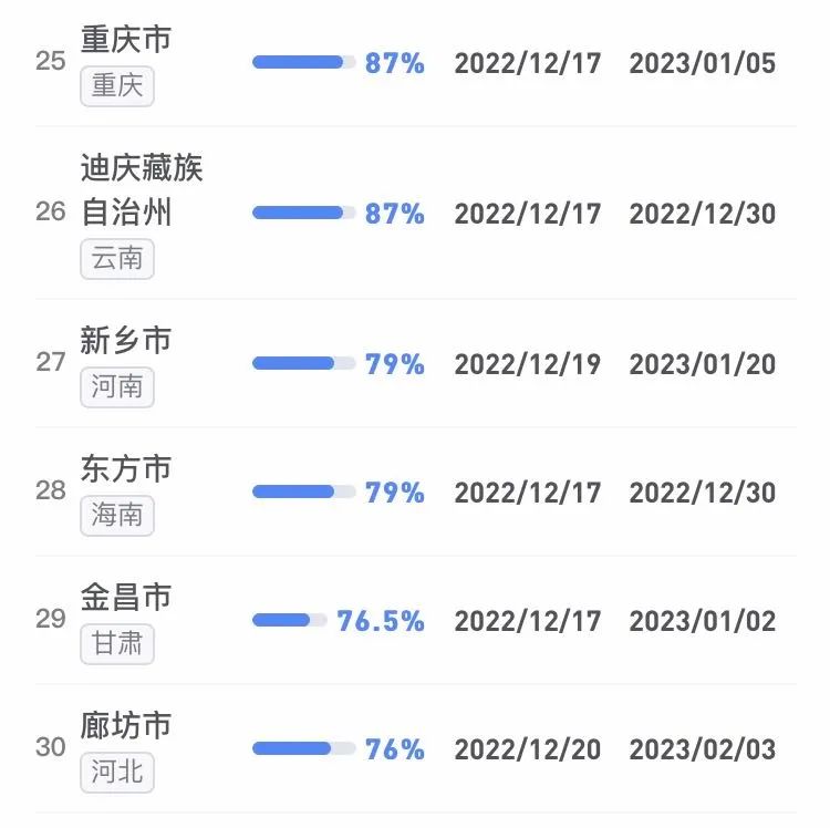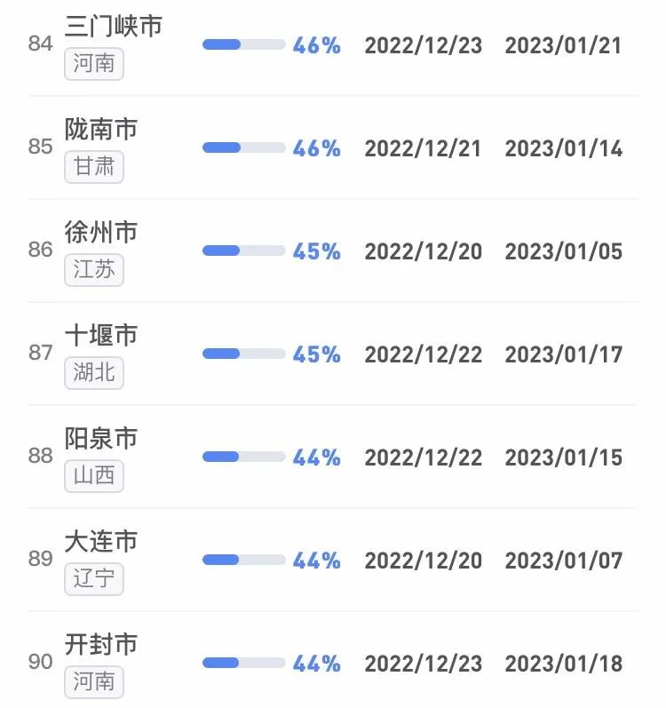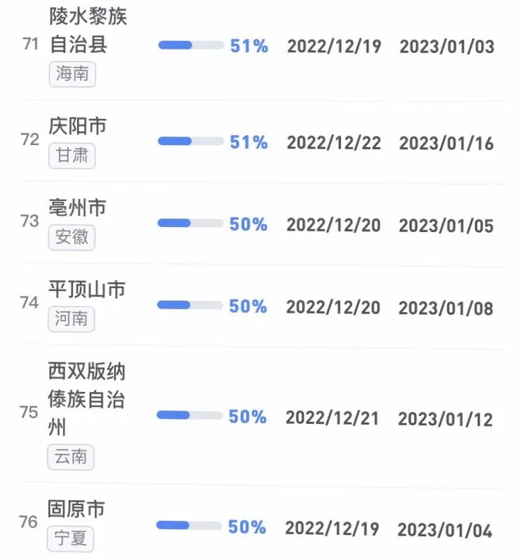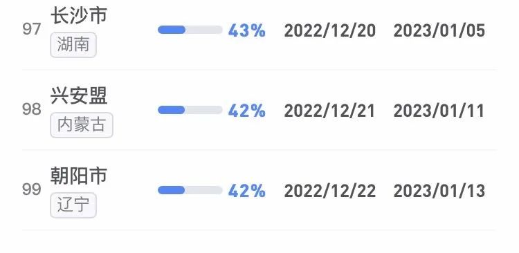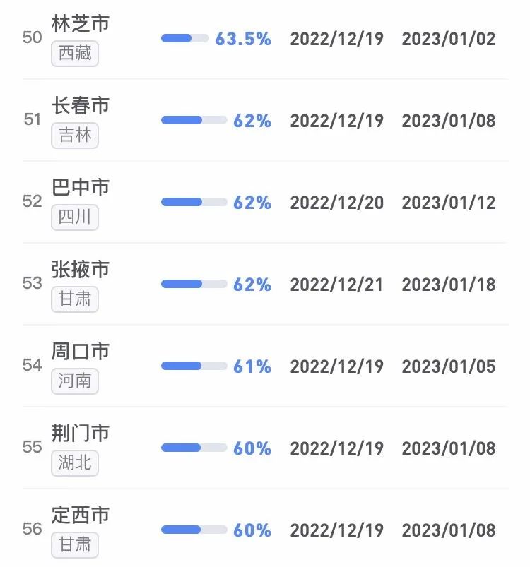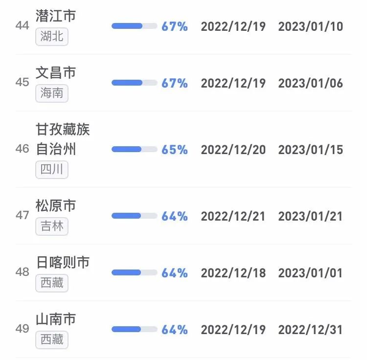 據(jù)不完全統(tǒng)計,全國感染進度100%的城市已累計達17個,其中石家莊市、保定市、甘南藏族自治州、克孜勒蘇柯爾克孜自治州均在12日就達到首輪感染峰值。成都市、武漢市等76個市達峰進度已超過50%。