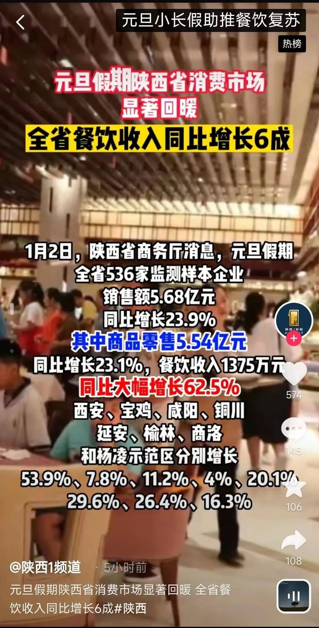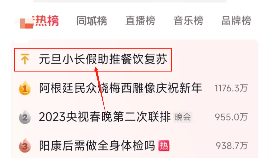 近日,“元旦小長(zhǎng)假助推餐飲復(fù)蘇”登上了熱榜。陜西全省餐飲收入同比增長(zhǎng)6成,天津元旦假期重點(diǎn)企業(yè)實(shí)現(xiàn)銷售超10億元,楊州望月路、國慶路上的店鋪回到了往日的喧鬧……