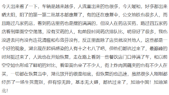 有網(wǎng)友在媒體平臺(tái)發(fā)消息稱,陽的第一第二批基本康復(fù)了,有的還在康復(fù)中,公交地鐵有很多人,路過幾家藥店,看到除了店員沒有其他人,餐飲店門口停滿了車,街上炸肉圓藕夾的也有不少人在買,一切都在恢復(fù)當(dāng)中。