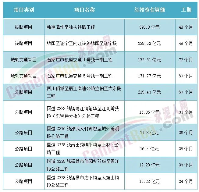 據(jù)水泥人網(wǎng)了解,近日,有多個重大項目獲批,其中包括多個鐵路、城軌交通、公路等項目,項目總投資額達1300多億元,其中部分項目中標單位已經(jīng)確定中鐵建下屬公司。