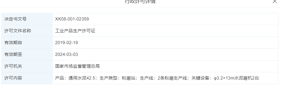 其工業(yè)品生產(chǎn)許可證(XK08-001-02359)信息顯示,企業(yè)為擁有兩條粉磨生產(chǎn)線的粉磨站,關(guān)鍵設(shè)備為φ3.2×13m水泥磨機兩臺。