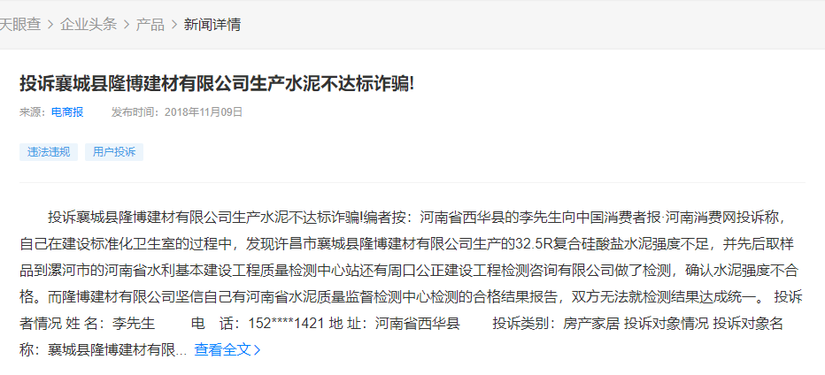新聞輿情顯示,企業(yè)在2018年曾因生產(chǎn)水泥不達標(biāo)被投訴。
