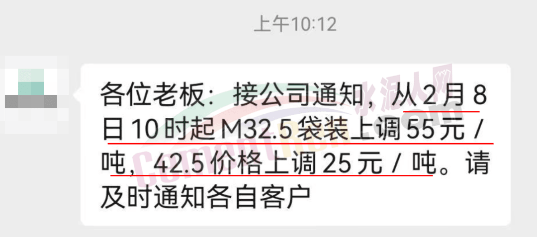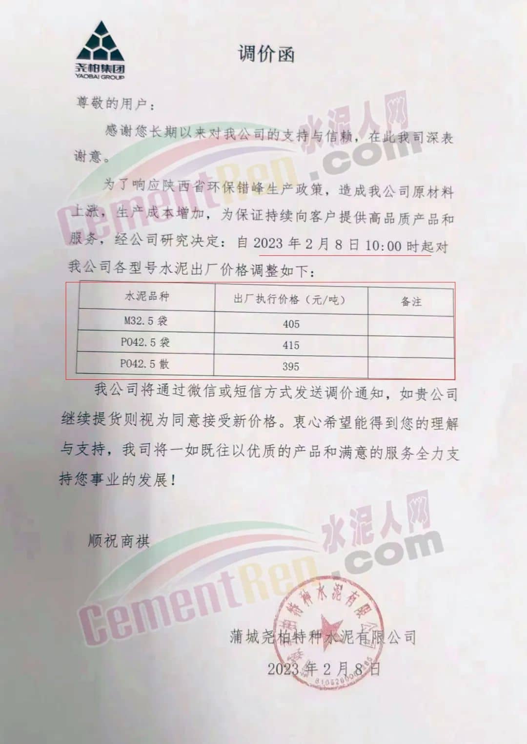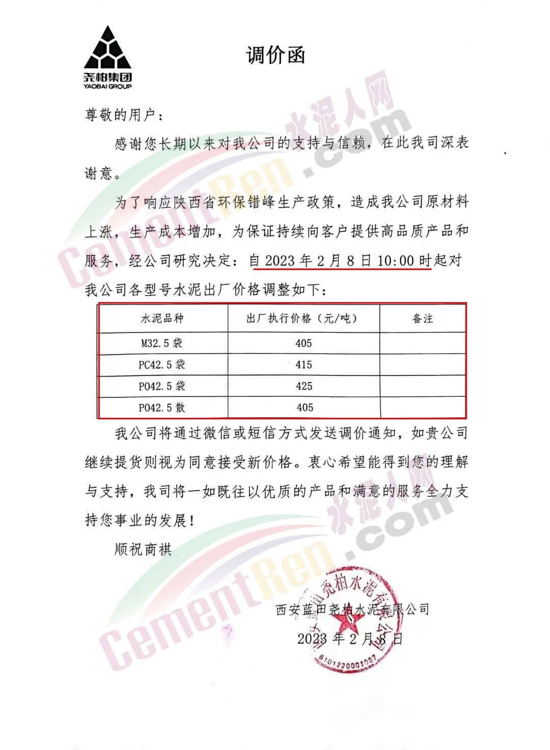 企業(yè)調(diào)價(jià)通知中提到,為響應(yīng)陜西省環(huán)保錯(cuò)峰生產(chǎn)政策,造成公司原材料上漲,生產(chǎn)成本增加,為保證持續(xù)向客戶提供高品質(zhì)產(chǎn)品和服務(wù)經(jīng)公司研究決定自2月8日10時(shí)起對(duì)公司各型號(hào)水泥出廠價(jià)格進(jìn)行調(diào)整。調(diào)價(jià)后,如客戶繼續(xù)提貨則視為同意價(jià)格。