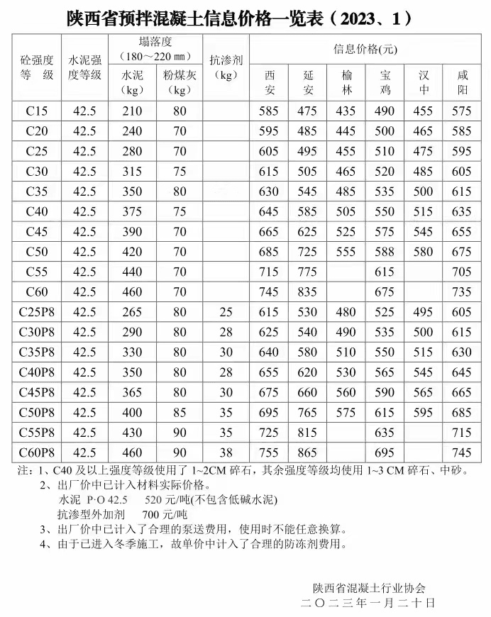 從陜西省混凝土行業(yè)協(xié)會(huì)近期發(fā)布的2023年1月預(yù)拌混凝土信息價(jià)格一覽表中可見(jiàn),西安、延安、榆林、寶雞 、漢中、咸陽(yáng)5個(gè)地區(qū)C30混凝土報(bào)價(jià)與2022年12月份持平。預(yù)拌混凝土材料實(shí)際價(jià)格中P.O42.5按520元/噸計(jì)算。上述主要品牌企業(yè)P.O42.5散裝水泥出廠價(jià)格上調(diào)后仍不足400元/噸,與信息價(jià)備注中的520元/噸仍相差125元/噸。