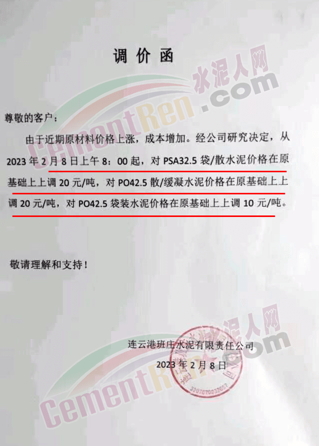 連云港班莊水泥有限責(zé)任公司通知稱(chēng),由于近期原材料價(jià)格上漲,成本增加。經(jīng)公司研究決定,從2023年2月8日上午8:00起,對(duì)PSA325袋/散水泥價(jià)格在原基礎(chǔ)上上調(diào)20元/噸,對(duì)PO42.5散/緩凝水泥價(jià)格在原基礎(chǔ)上上調(diào)20元/噸,對(duì)PO42.5袋裝水泥價(jià)格在原基礎(chǔ)上上調(diào)10元/噸。