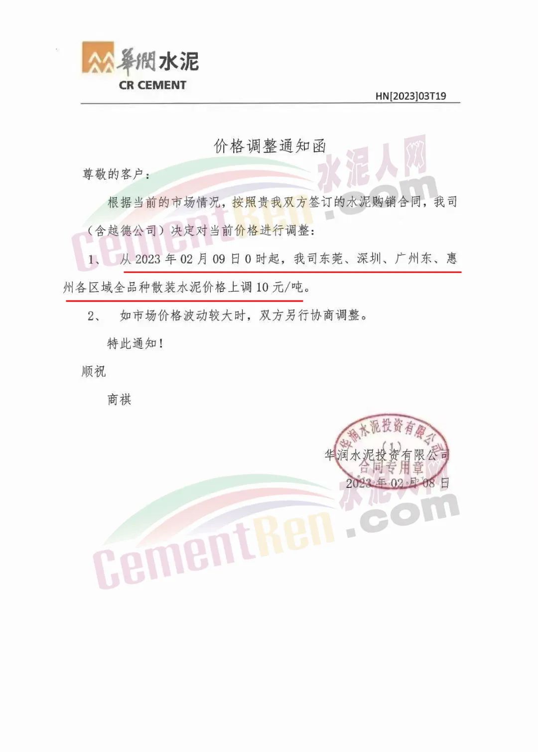華潤(rùn)水泥通知稱(chēng),根據(jù)當(dāng)前的市場(chǎng)情況,從2月9日0時(shí)起,公司東莞、深圳、廣州東、惠州各區(qū)域全品種散裝水泥價(jià)格上調(diào)10元/噸。