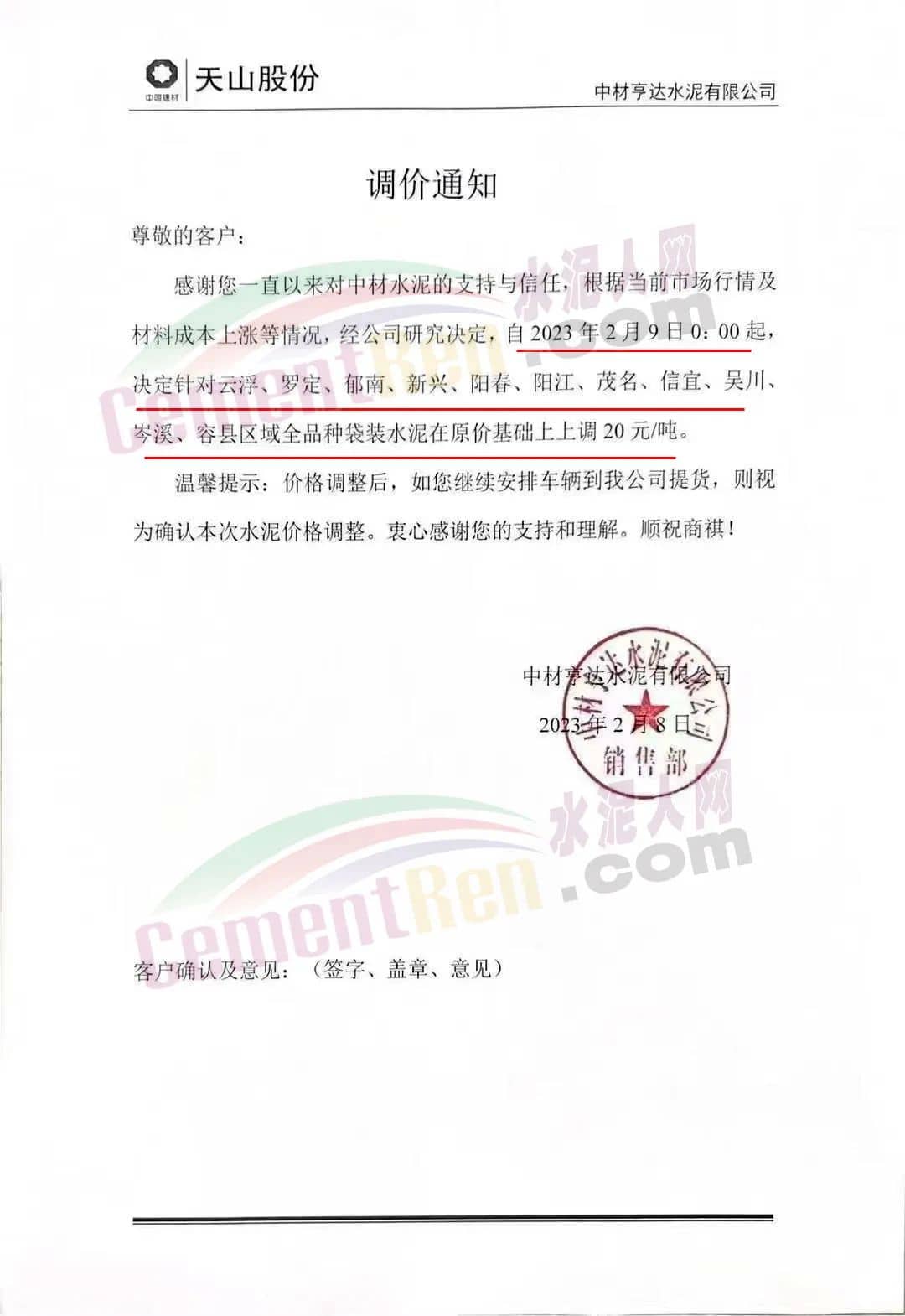 中材天山(云浮)水泥有限公司、中材亨達(dá)水泥有限公司、中材羅定水泥有限公司調(diào)價(jià)通知稱(chēng),根據(jù)當(dāng)前市場(chǎng)行情及材料成本上漲等情況,經(jīng)公司研究決定,自2023年2月9日0時(shí)起決定針對(duì)云浮、羅定、郁南、新興、陽(yáng)春、陽(yáng)江、茂名、信宜、吳川、岑溪、容縣區(qū)域全品種袋裝水泥在原價(jià)基礎(chǔ)上上調(diào)20元/噸。