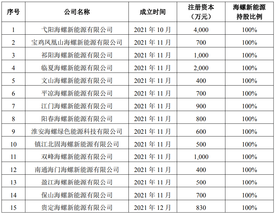 2021年10月至12月,海螺新能源獨(dú)立出資設(shè)立了15家新能源公司。