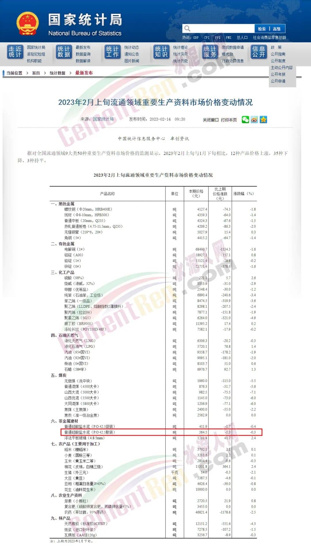 2月14日,國(guó)家統(tǒng)計(jì)局公布了2023年2月上旬流通領(lǐng)域重要生產(chǎn)資料市場(chǎng)價(jià)格變動(dòng)情況,其中P.O42.5散裝水泥報(bào)價(jià)384.5元/噸,較1月下旬下跌發(fā)1.3元/噸,跌幅0.3%。同比上年2月份470.1元的報(bào)價(jià)下跌85.6元/噸,跌幅達(dá)18.2%。