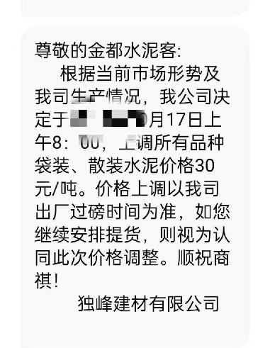 水泥人網(wǎng)通訊員消息,日前獨(dú)峰建材有限公司通知,根據(jù)當(dāng)前市場形勢及公司生產(chǎn)情況決定于17日上午8時(shí)起,上調(diào)所有品種袋裝、散裝水泥價(jià)格30元/噸。經(jīng)銷商提醒“18號還要漲價(jià),這情況少見,想存貨得趕緊了”。