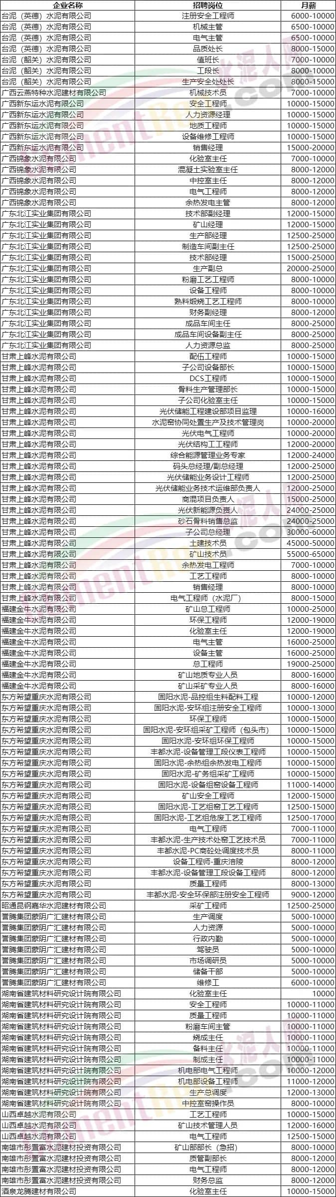 水泥人網(wǎng)通訊員消息:近期水泥行業(yè)投簡(jiǎn)歷找工作的人多了起來(lái),發(fā)招聘啟事的企業(yè)卻不太多了,薪資高的崗位的更是少見了。水泥人網(wǎng)信息平臺(tái)也收到許多求職簡(jiǎn)歷,希望幫忙介紹水泥廠相關(guān)崗位。水泥人網(wǎng)特將近期發(fā)布招聘啟事,且月薪在萬(wàn)元以上的招聘信息綜合如下: