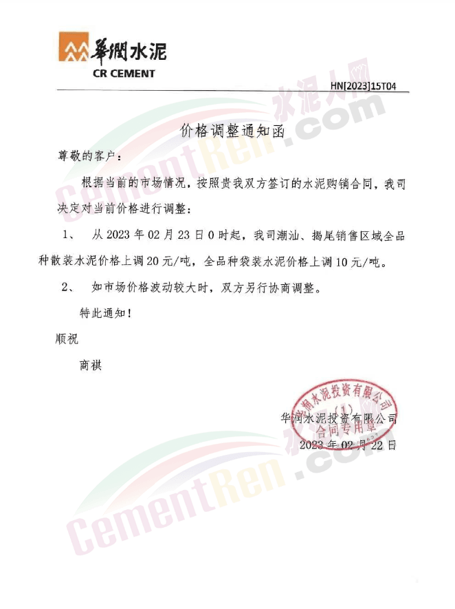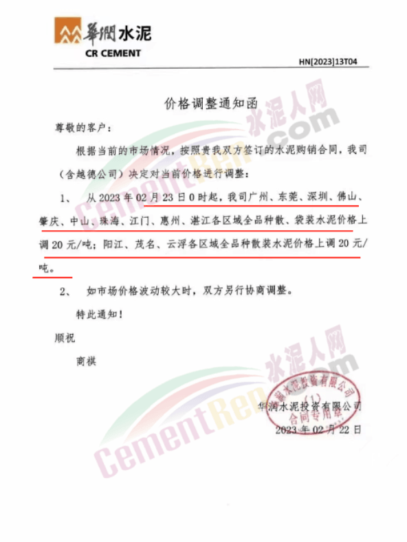 華潤水泥通知從2023年2月23日0時起,廣州、東莞、深圳、佛山、肇慶、中山、珠海、江門、惠州、湛江各區(qū)域全品種散、袋裝水泥價格上調20元/噸;陽江、茂名、云浮各區(qū)域全品種散裝水泥價格上調20元/噸;潮汕、揭尾銷售區(qū)域全品種散裝水泥價格上調20元/噸,全品種袋裝水泥價格上調10元/噸。