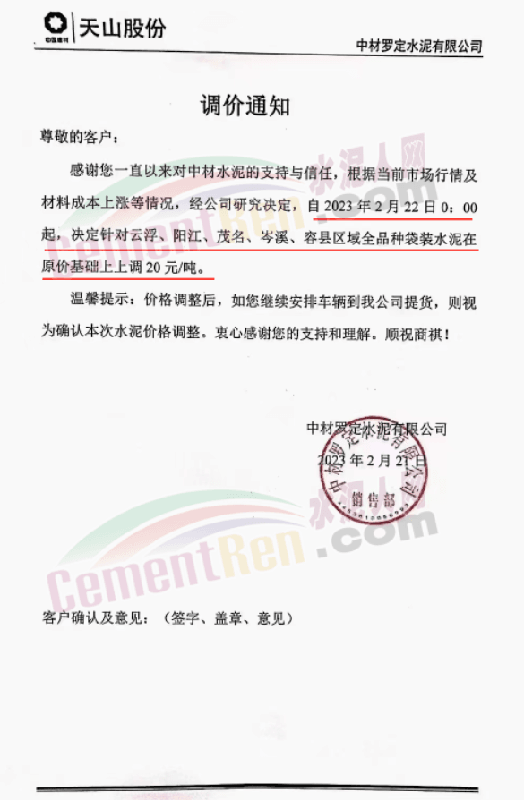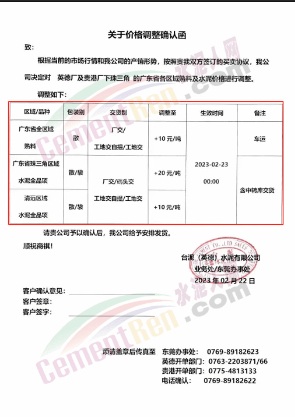從2023年2月23日零時起所生產的“金鷹”牌水泥、熟料銷售價格在原《購銷合同)(包括《合同補充協(xié)議》)確定的價格基礎上價格做調整。粵西區(qū)域:茂名、信宜、陽江、陽春、云浮(云城、云安、新興、羅定、郁南)全品種散裝水泥上升20元/噸;除上述粵西域外其他區(qū)域全品種袋裝和散裝水泥上升20元/噸;全區(qū)域熟料上升10元/噸。
