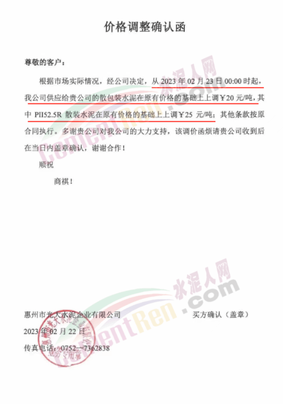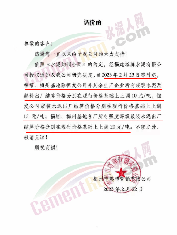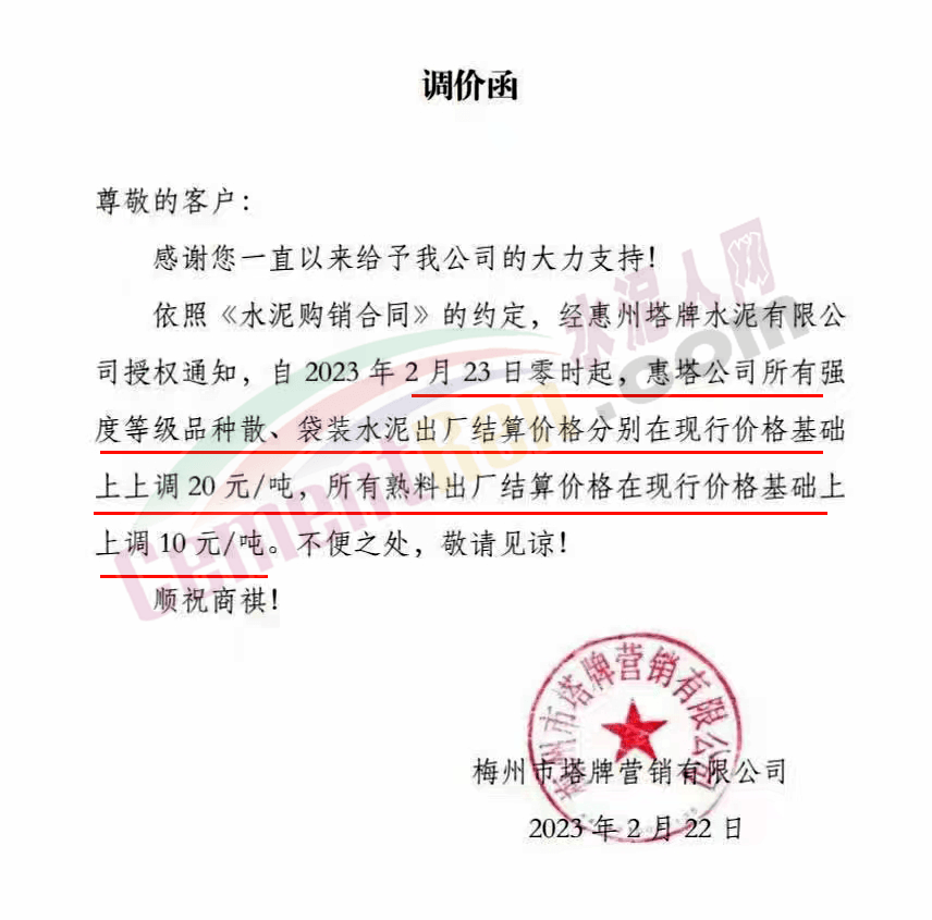 梅州市塔牌營銷有限公司通知,經福建塔牌水泥有限公司授權通知及公司研究決定,自2023年2月23日零時起福塔、梅州基地除恒發(fā)公司外其余生產企業(yè)所有袋裝水泥及熟料出廠結算價格分別在現(xiàn)行價格基礎上上調10元/噸,恒發(fā)公司袋裝水泥出廠結算價格分別在現(xiàn)行價格基礎上上調15元/噸;福塔、梅州基地各廠所有強度等級散裝水泥出廠結算價格分別在現(xiàn)行價格基礎上上調20元/噸。
