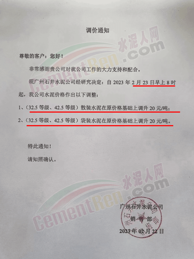 廣州石井水泥、石井德慶水泥通知從2023年2月23日上午8時起,水泥價格上調20元/噸。