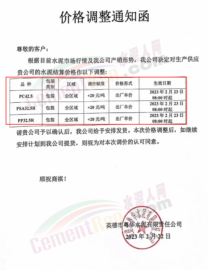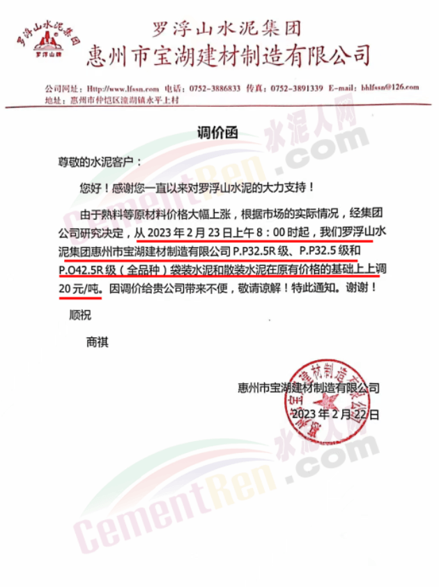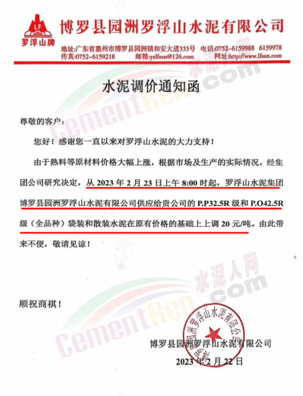 博羅縣園洲羅浮山水泥有限公司通知,由于熟料等原材料價格大幅上漲,根據市場及生產的實際情況,經集團公司研究決定,從2023年2月23日上午8:00時起,羅浮山水泥集團博羅縣園洲羅浮山水泥有限公司PP325R級和P425R級(全品種)袋裝和散裝水泥在原有價格的基礎上上調20元/噸。