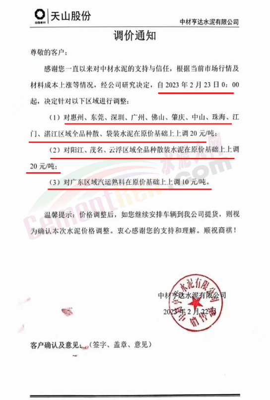 中材亨達水泥有限公司通知,根據當前市場行情及材料成本上漲等情況,經公司研究決定,自2023年2月23日0時起: 對惠州、東莞、深圳、廣州、佛山、肇慶、中山、珠海、江門、湛江區(qū)域全品種散、袋裝水泥在原價基礎上上調 20 元/噸;對陽江、茂名、云浮區(qū)域全品種散裝水泥在原價基礎上上調20 元/噸;對廣東區(qū)域汽運熟料在原價基礎上上調10元/噸。