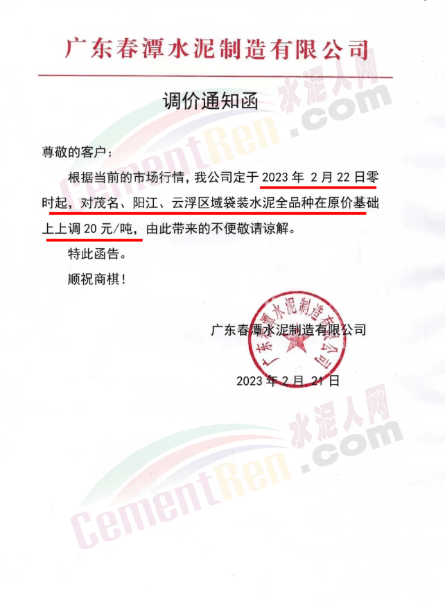 廣東春潭水泥制造有限公司通知,公司定于2023年2月22日零時起,對茂名、陽江、云浮區(qū)域袋裝水泥全品種在原價基礎上上調20元/噸。