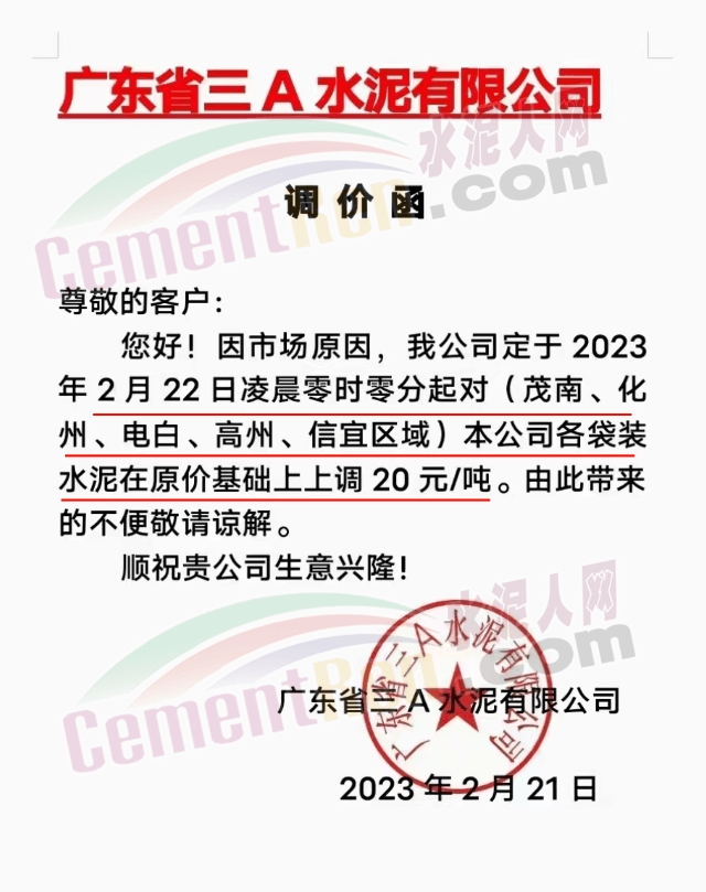 廣東省三A水泥有限公司通知,因市場原因,定于2月22日凌晨對茂南、化州、電白、高州、信宜區(qū)域袋裝水泥價格上調20元/噸。